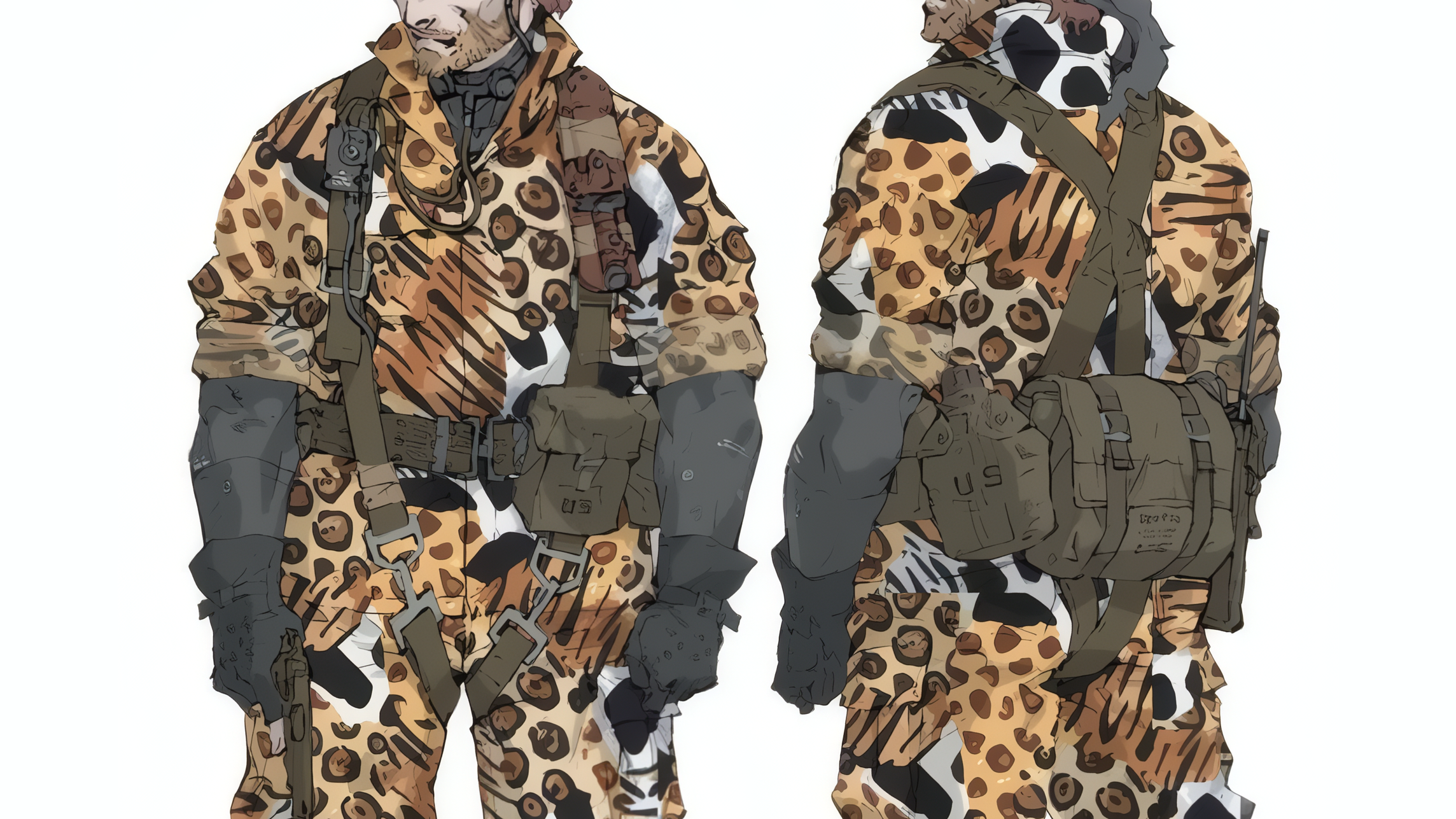 The design’s origins are tied to FOXHOUND, the covert unit recognized for creating and deploying specialized camouflage and experimental gear. Within that framework, the Animal Camouflage functioned not only as a concealment pattern but also as a symbolic extension of the group’s culture of animal-coded identities. Figures such as Ocelot, long associated with FOXHOUND, reinforced this convergence of biological metaphor and tactical practice. In that sense, the Animal Camouflage stands as both a disruptive field pattern and an emblem of FOXHOUND’s experimental doctrine.